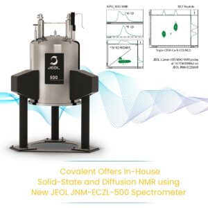 “Covalent is the first commercial lab to offer both solid-state and diffusion-probe NMR services. With this new spectrometer, our clients will be able to glean deeper insights into their advanced materials and devices, using methods that would otherwise be impossible to obtain outside a university lab,” said Yihung Lin, Ph.D., Vice President of the Analytical Services Group at Covalent. “The JNM-ECZL-500 is exactly the tool we need to meet the unique material design challenges of our clients – especially those working with batteries, polymers, and carbon-capture materials.”