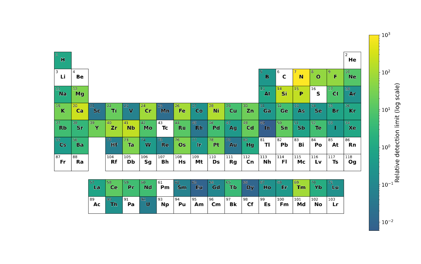 Relative detection limits of elements by neutron activation analysis, from percent-levels. Elements that are not measured by neutron activation are not colored.