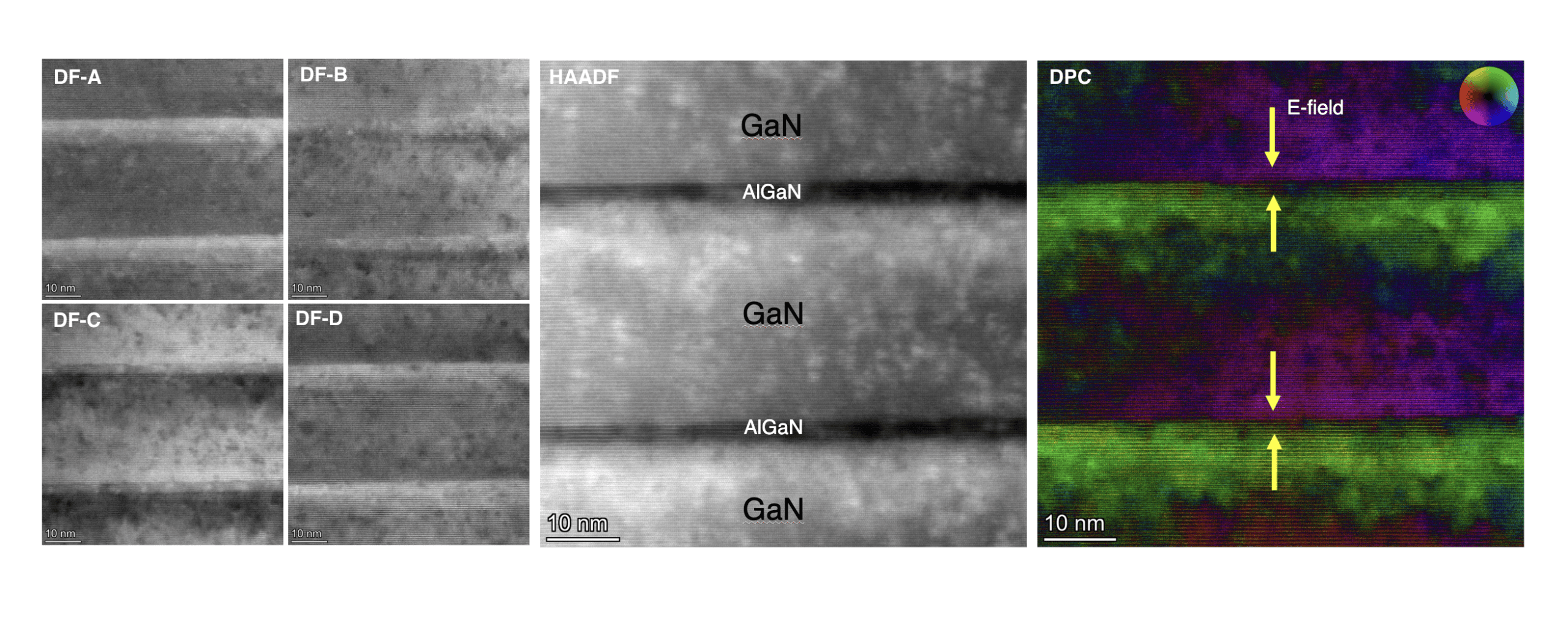 DPC uses a segmented detector located underneath the sample to measure the beam deflection at each pixel. Areas of the sample that are electrically polarized will deflect the beam and intensity differences are then converted into field direction and relative strength maps.