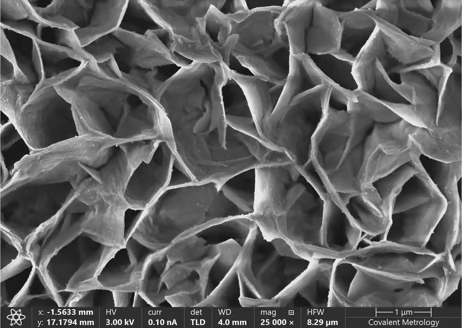 High resolution, secondary electron image of a grown thin film layer on a metallic substrate. The large depth of field in SEM allows the 3D topography of the thin film layer to be highlighted.