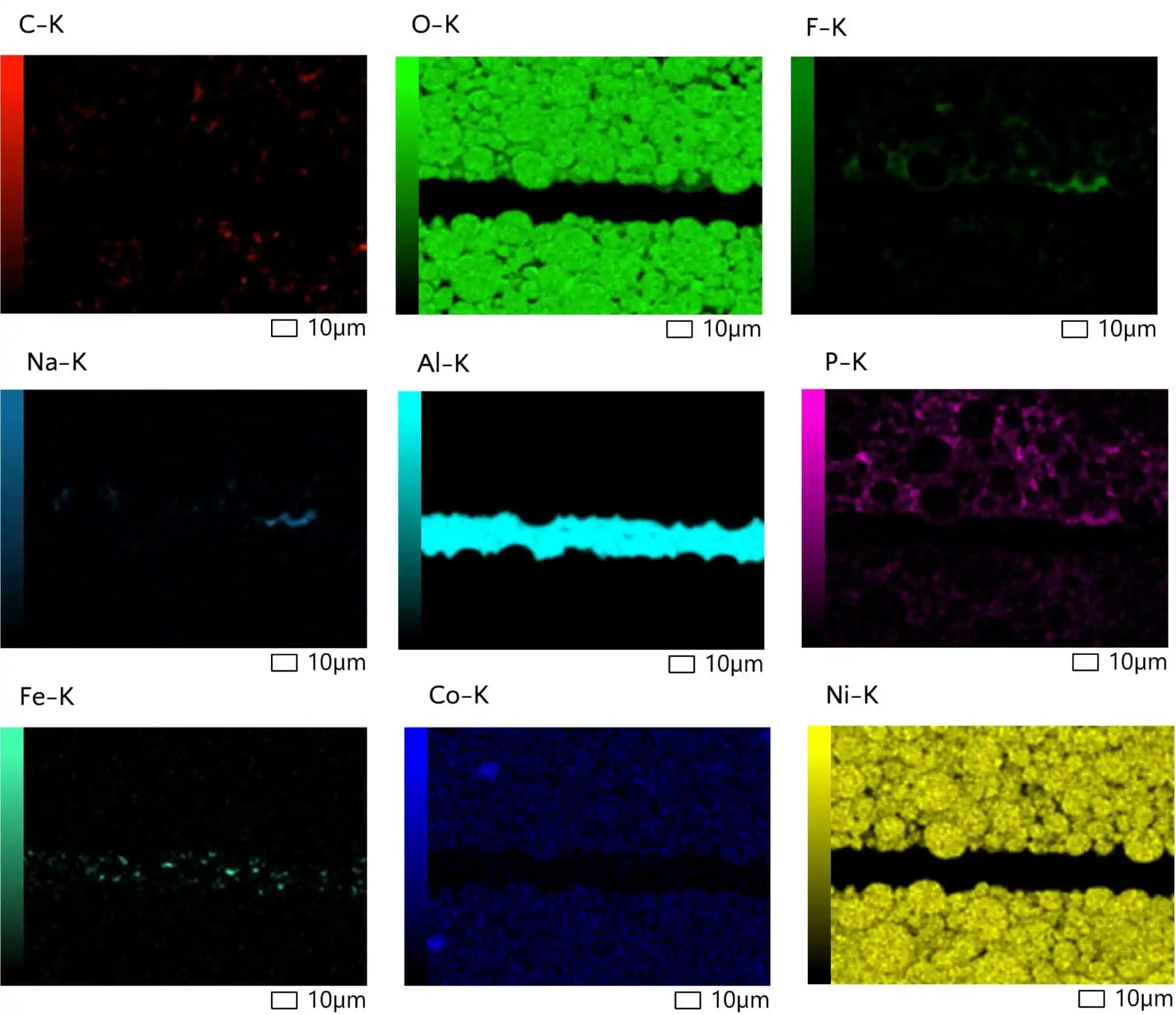 Individual elemental maps and of a cross sectioned battery cathode. The elemental maps reveals that the spherical cathode particles are primarily Ni, O and Co rich. The binder material is primarily C, F, P and Na rich. The center current collector is primarily Al, with Fe inclusions.