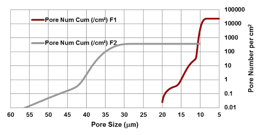 Example capillary flow porometry (CFP) pore size distribution graph showing cumulative pore number per cm² versus pore size (µm) for membrane samples F1 and F2, illustrating pore size range and total porosity