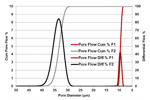 Example plot of cumulative flow % and differential flow % contrast with pore size for the same two samples shown above. These plots are computed from the raw flow rate data and can be used to analyze minimum, maximum, and average pore sizes in each sample. Sample F1 has average through-pore diameter of 9.5 μm and Sample F2 has an average through-pore diameter of approximately 33 μm.