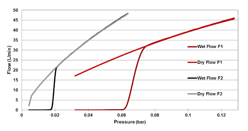 Raw Flow Rate versus Pressure data for the samples F1 and F2 shown above. These are collected in two phases: a wet-flow state (during liquid displacement) and dry flow state (after all liquid is removed).