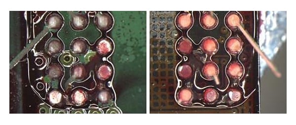 - Inspecting the surfaces: Any cracks or other defects will be stained, indicating weak or failed connections. Silver areas with no visible dye, on the other hand, reflect solid, intact joint solders. Each joint is then closely inspected at a minimum 40X magnification using a digital optical microscope for the ultra-high resolution required for complete and accurate analysis.