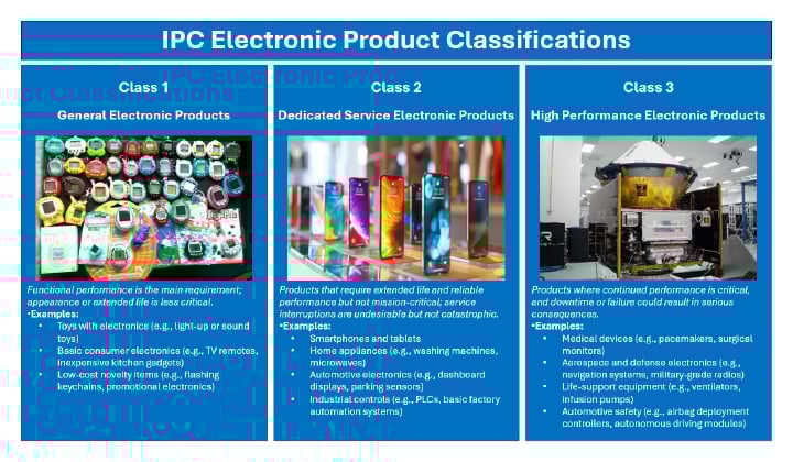 This image is a blue-themed infographic titled “IPC Electronic Product Classifications” and is divided into three vertical sections. Each section represents a different IPC-A-610 product.