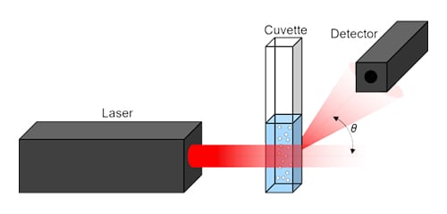 A simplified schematic of a basic DLS measurement setup, including a red laser directed at a cuvette with particles suspended in a liquid. The laser light scatters off the particles and is measured by a detector at an angle θ from the incident beam (90° as shown).