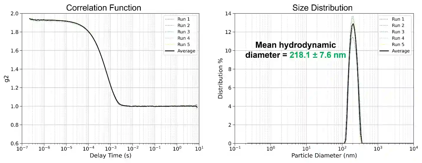 In this example, five replicate runs yield a narrow peak at ~218 nm (±7.6 nm), indicating a well-dispersed and consistent sample. The data provides key insights into aggregation, uniformity, and dispersion quality.