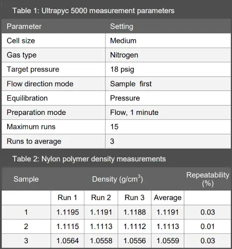 Tables showing Ultrapyc 5000 gas pycnometer measurement parameters and nylon polymer density results.