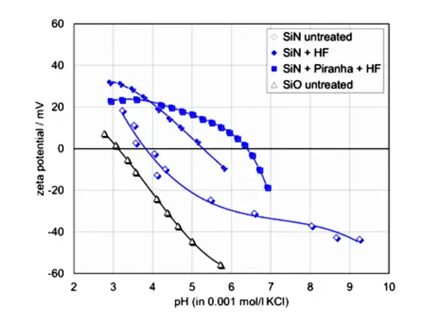 Zeta potential distribution of carbon-black dispersed in toluene (left) and surface zeta potential of SiN wafers after cleaning by hydrofluoric acid, displayed as a function of pH (right).